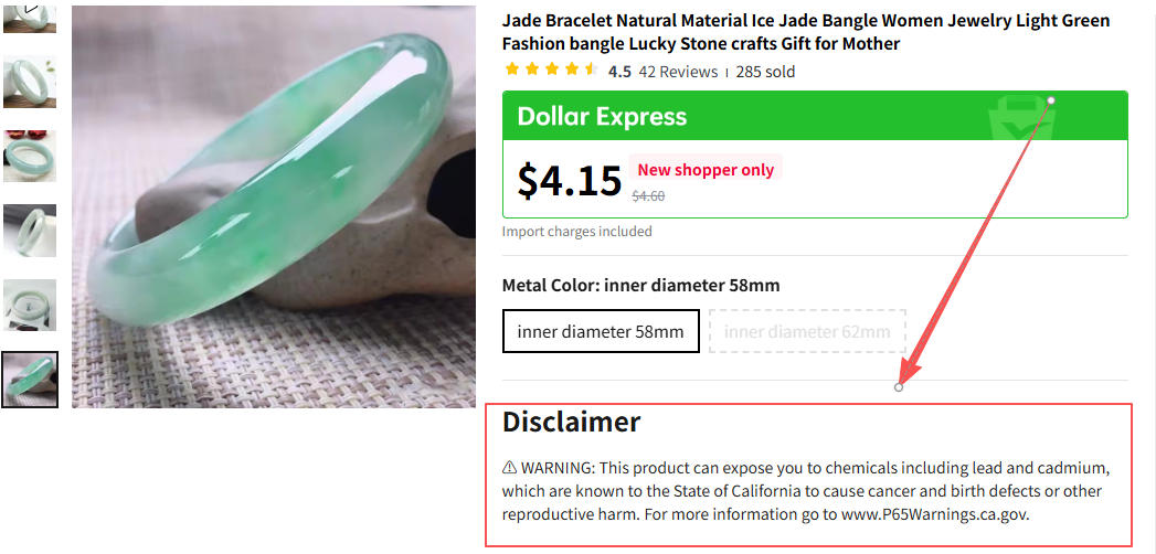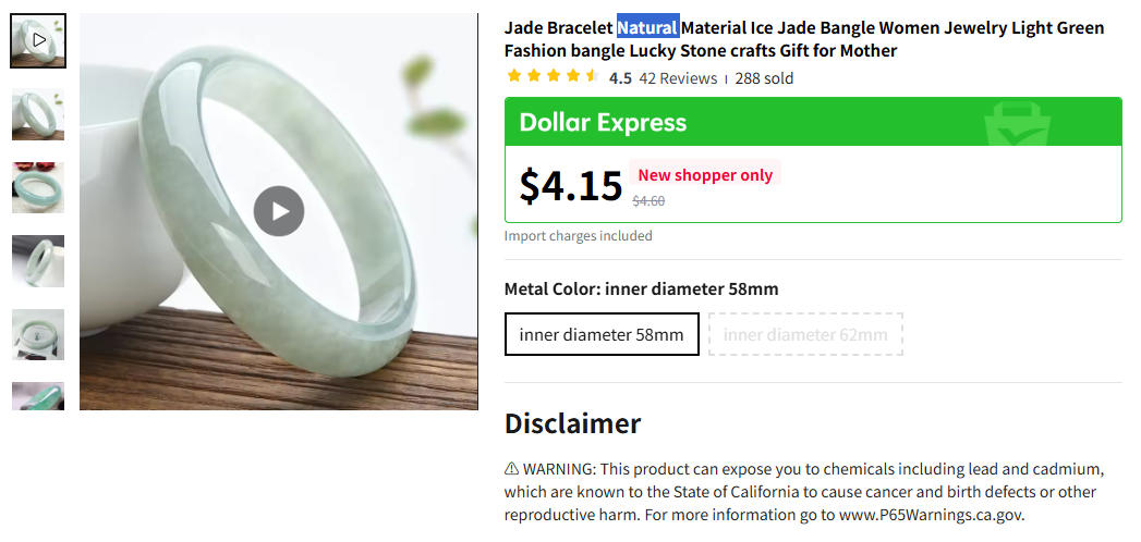 你打开任何一个有关“玉”的产品页面,都会有这样的一段警告:⚠ WARNING: This product can expose you to chemicals including lead and cadmium, which are known to the State of California to cause cancer and birth defects or other reproductive harm. For more information go to www.P65Warnings.ca.gov