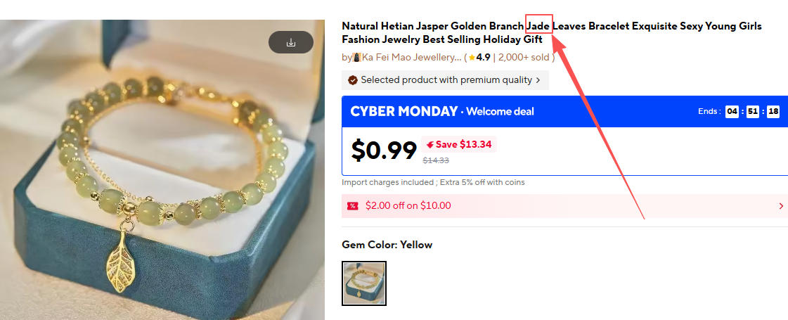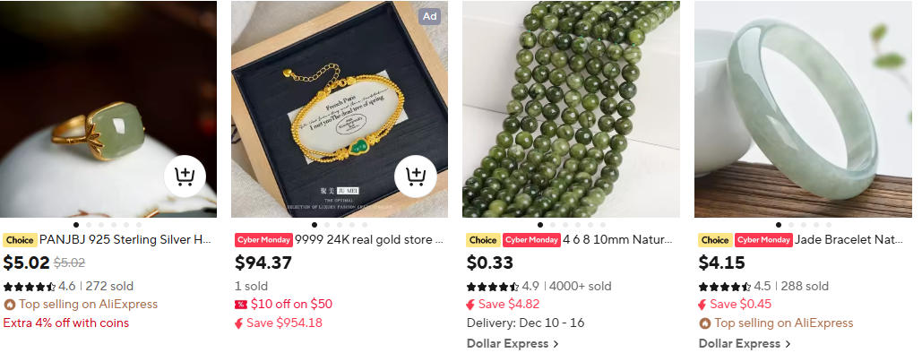 包括今天的速卖通,依然存在使用“Jade”(玉器)这类的词语在卖仿玉,