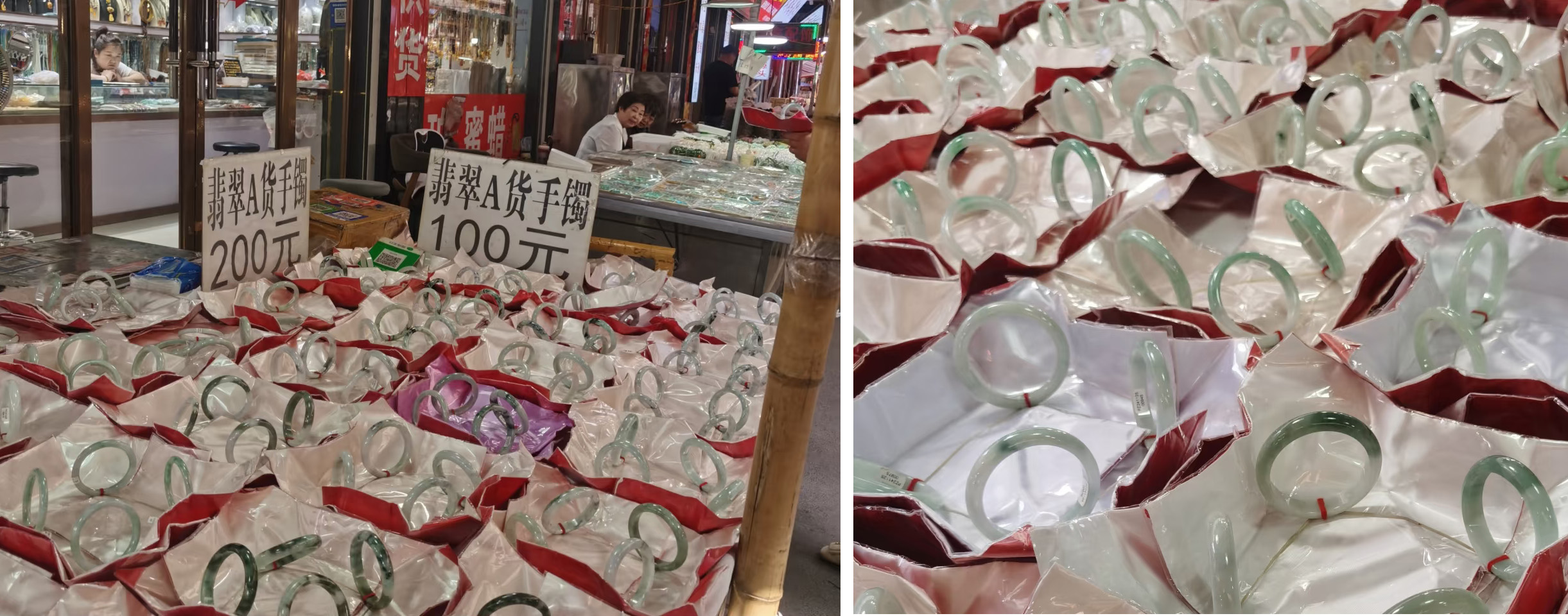 原材料多为底端玉器边角料、俄料、韩料,甚至,绝大多数只是玻璃或者树脂压制品。