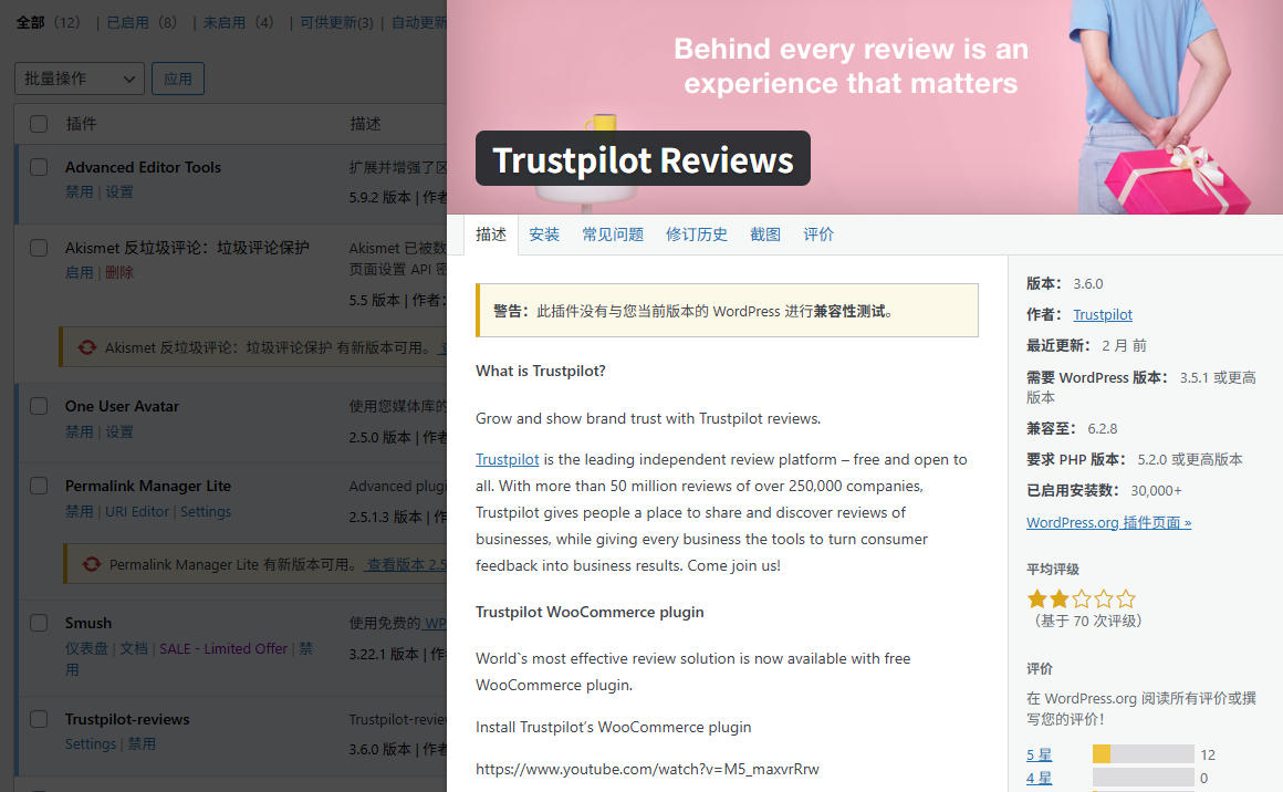 比如,在wordpress插件市场上,直接安装Trustpilot Reviews插件,关联账户即可生效。